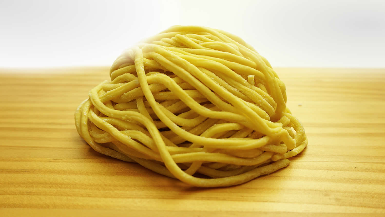 もちもちの弾力をさらに付加するために卵白を追加投入し、加水率も多めに設定して仕上げています。三沢製麺の自慢の麺の一つです。これ以上のもちもち食感のおいしい麺は不可能という、ギリギリ限界値を狙って作り上げました。